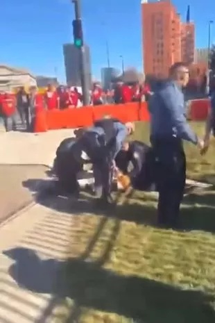 Panic struck during the parade at Union Station after three armed suspects reportedly opened fire west of the station's parking garage, with one confirmed dead and up to 29 injured - including eight children. Footage captured the moment fans rushed to tackle on suspect to the floor, with Paul Contreras recounting how he jumped to action.